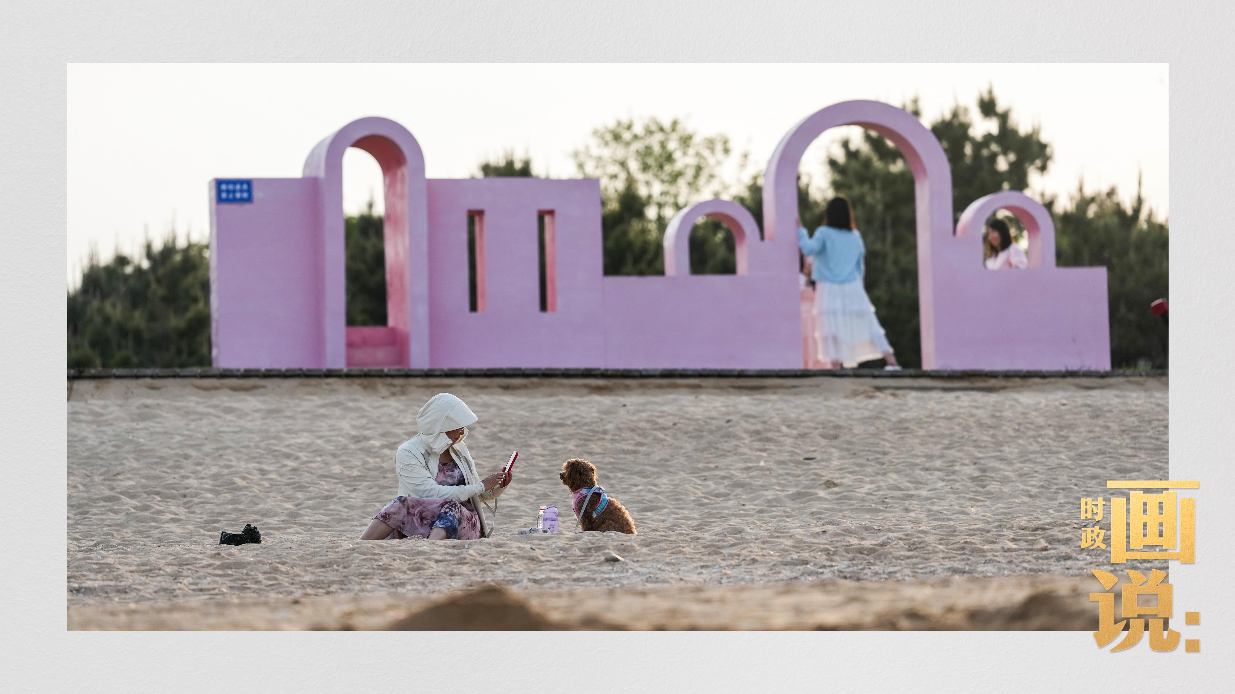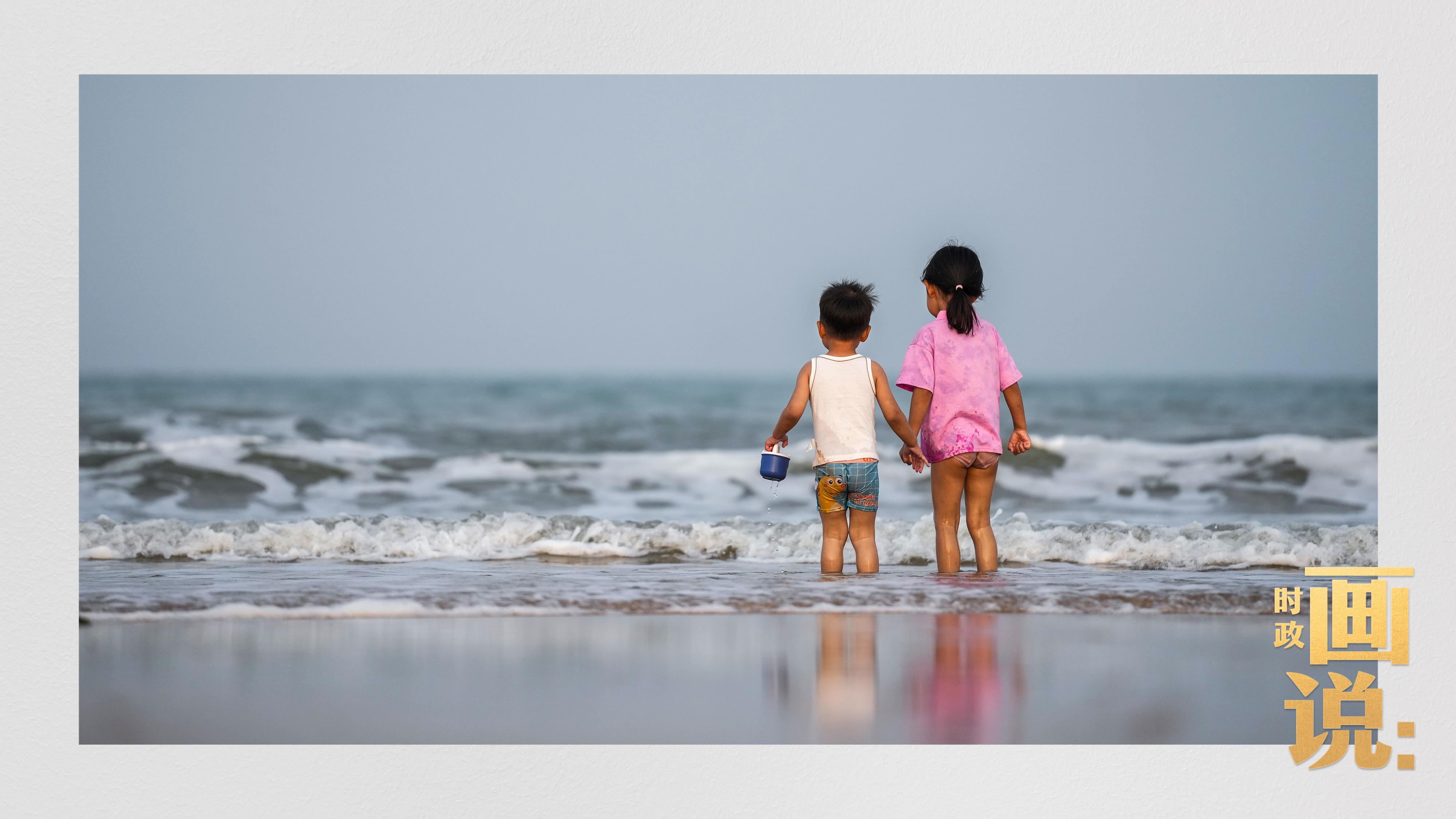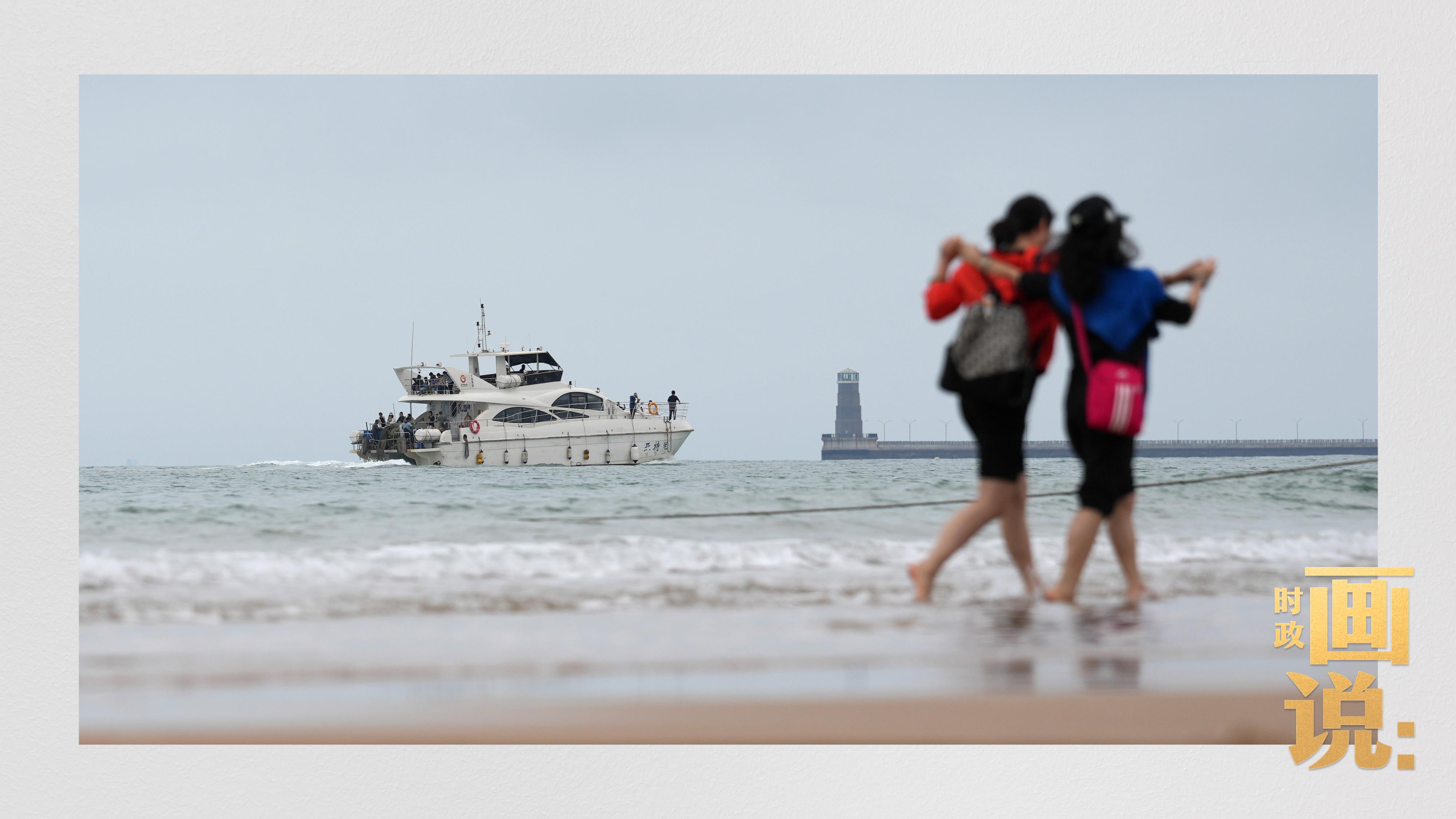 △日照阳光海岸绿道上的万平口景区,一对游客在海浪中翩然起舞。