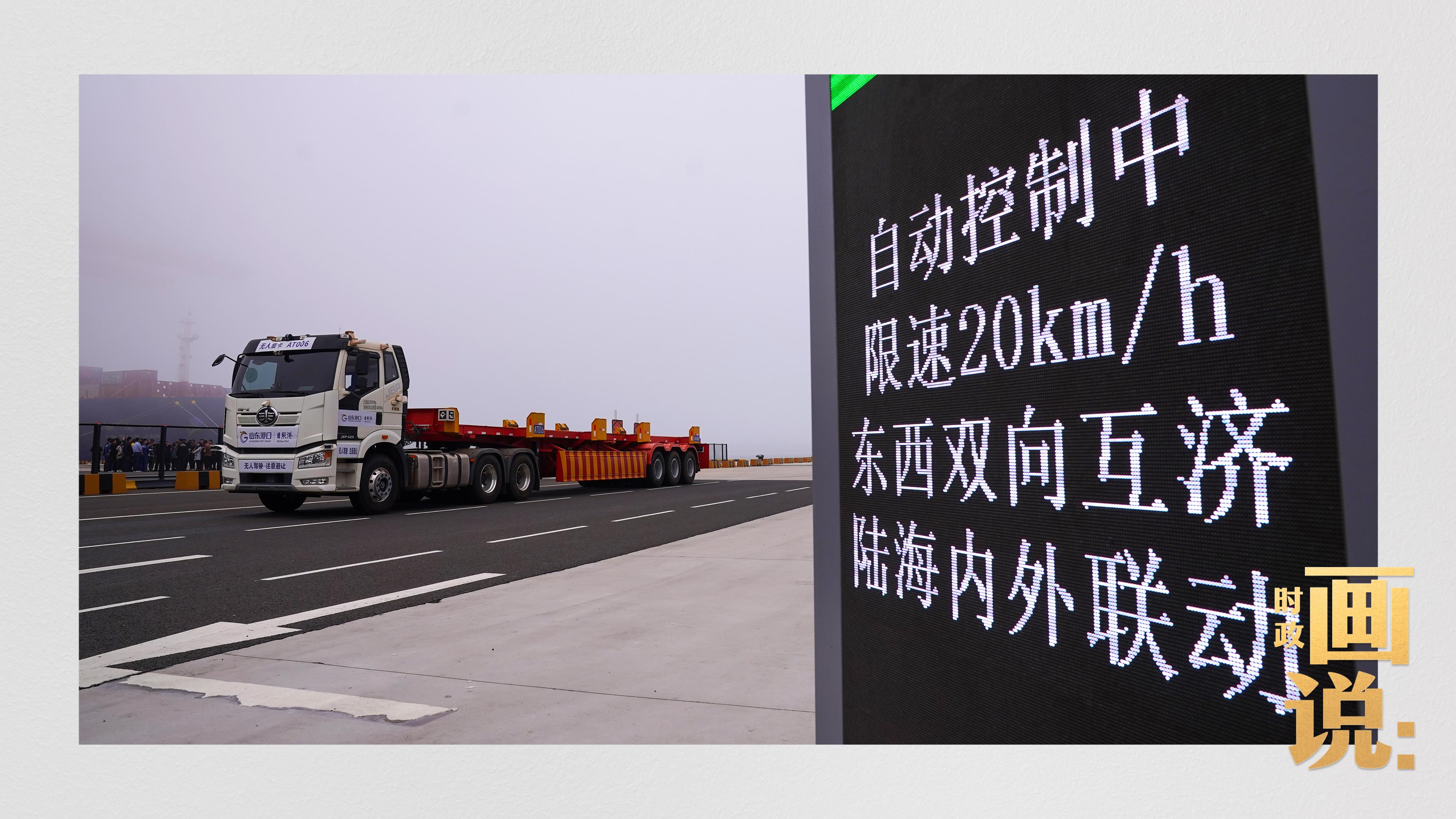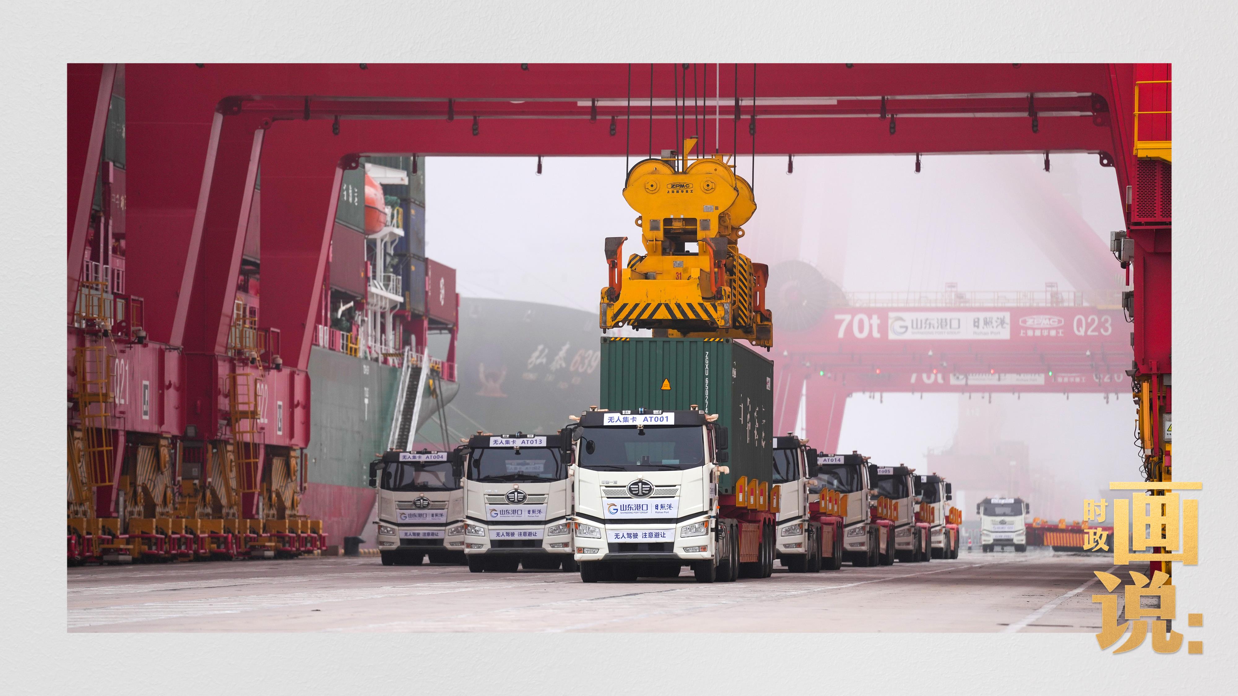 △山东港口集团日照港顺岸开放式全自动化集装箱码头,无人集卡车在运送集装箱。