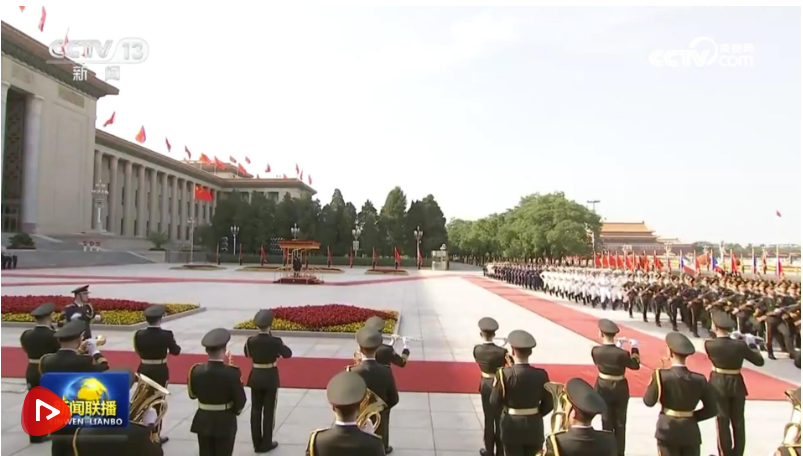 会谈前,习近平和夫人彭丽媛在人民大会堂东门外广场为奥比昂和夫人康斯坦西娅举行欢迎仪式。