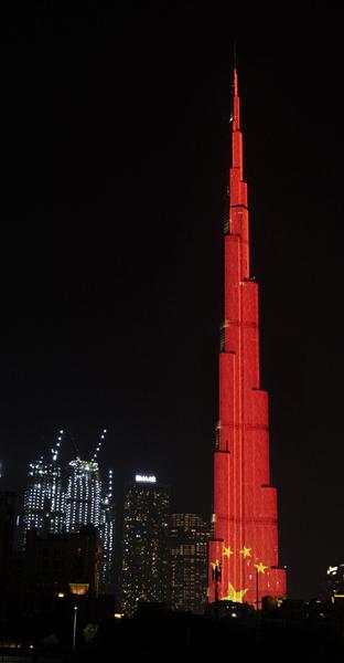 △当地时间2020年2月2日,在阿联酋迪拜,当地地标建筑物哈利法塔点亮中国国旗图案,为中国抗击新冠肺炎疫情加油。