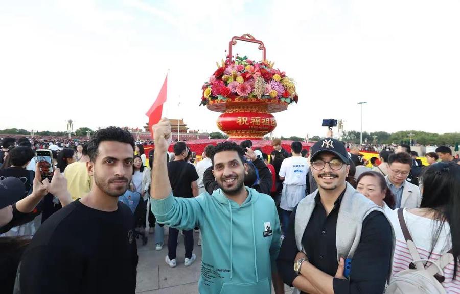 △2023年10月1日,三位来自阿尔及利亚的游客在北京天安门广场“祝福祖国”巨型花篮前留影。