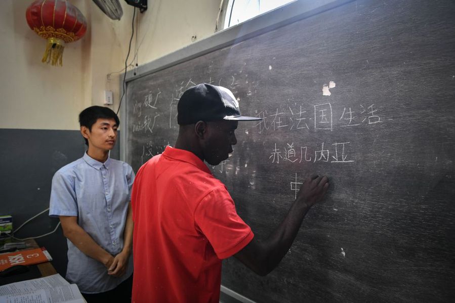 5月17日,在赤道几内亚国立大学,当地学生在孔子学院上中文课。