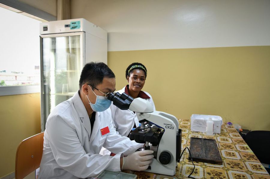 5月16日,在赤道几内亚马拉博地区医院,中国医生同当地同事一起检测样本。