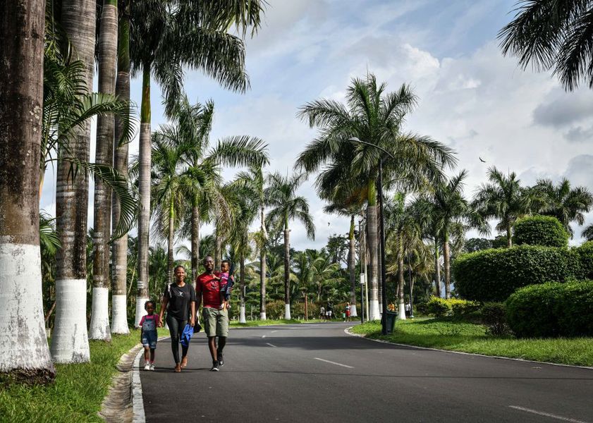 5月19日,在赤道几内亚首都马拉博,当地居民在中国企业承建的马拉博国家公园里散步。