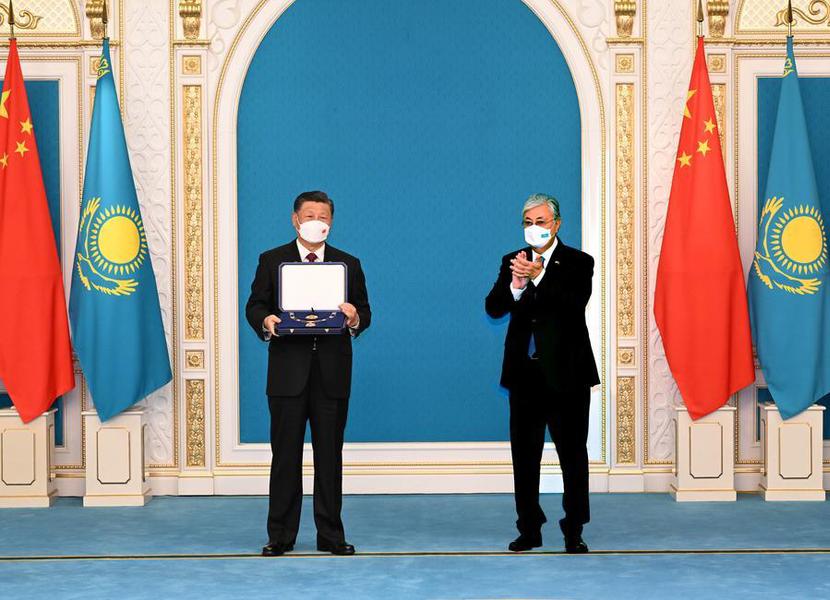 当地时间2022年9月14日下午,国家主席习近平在总统府接受哈萨克斯坦总统托卡耶夫授予“金鹰”勋章。(新华社记者 饶爱民 摄)