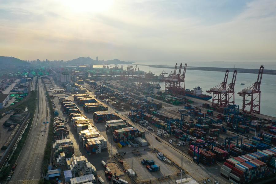 这是2023年5月9日拍摄的连云港港集装箱码头(无人机照片)。中哈连云港物流合作基地是“一带一路”倡议首个实体平台项目,成为哈萨克斯坦直抵太平洋的出海口。(新华社记者 季春鹏 摄)