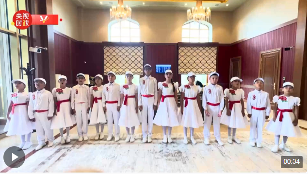 从北京到阿斯塔纳,千里之外的中亚上空响起熟悉的东方旋律。在迎宾仪式现场,十余名哈萨克斯坦少年儿童用中文演唱《歌唱祖国》。