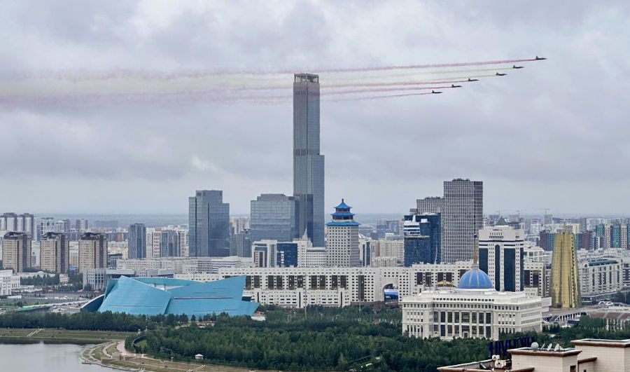 当地时间7月3日,国家主席习近平在阿斯塔纳出席哈萨克斯坦总统托卡耶夫举行的欢迎仪式。习近平乘车抵达总统府时,托卡耶夫总统热情迎接。六架哈萨克斯坦空军战机从总统府上空飞过,拉出象征中国国旗的红黄色彩烟,以最高礼仪欢迎习近平对哈萨克斯坦进行国事访问。