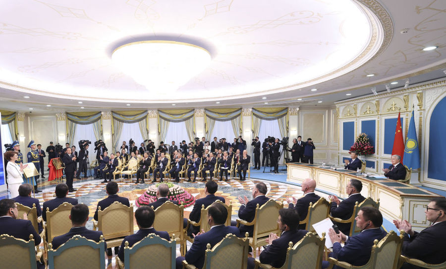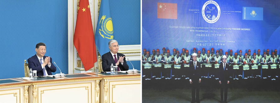 中午,习近平同托卡耶夫在阿斯塔纳总统府以视频方式共同出席中欧跨里海直达快运开通仪式。哈方项目负责人向两国元首汇报准备情况,中方项目负责人请两国元首下达指令。两国元首共同下达作业指令:“启运!”两国元首通过大屏幕观看车辆登船、集装箱装船等实时情况。现场响起热烈掌声。