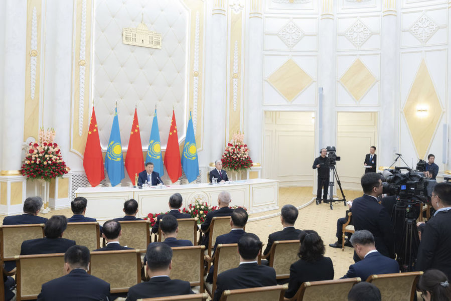 习近平在阿斯塔纳总统府同托卡耶夫共同会见记者。