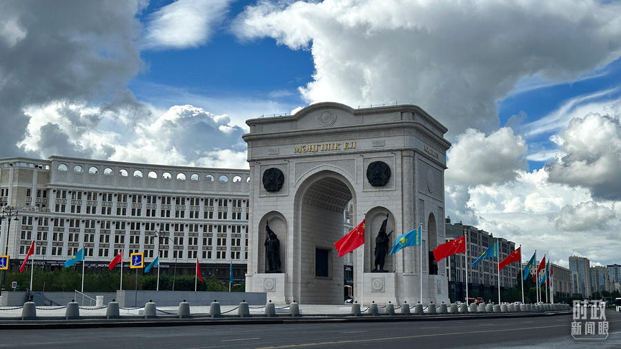 △阿斯塔纳地标建筑“凯旋门”两侧,中哈两国国旗迎风招展。(总台央视记者 关舟拍摄)