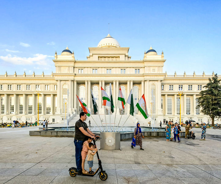 2024年7月1日,人们在塔吉克斯坦议会大楼前的广场上休闲。