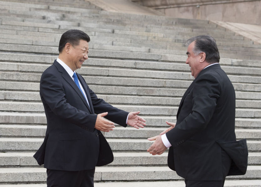 2019年6月15日,国家主席习近平在杜尚别出席仪式,接受塔吉克斯坦总统拉赫蒙授予“王冠勋章”。