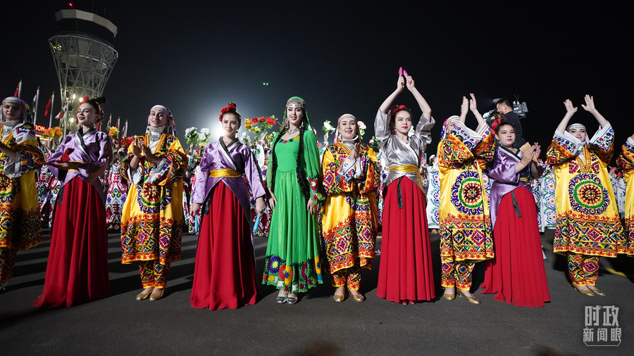 1500多名身着民族盛装的塔吉克斯坦青年,表演富有浓郁特色的中塔歌舞,挥舞中塔两国国旗,表达对中国领导人的热烈欢迎。