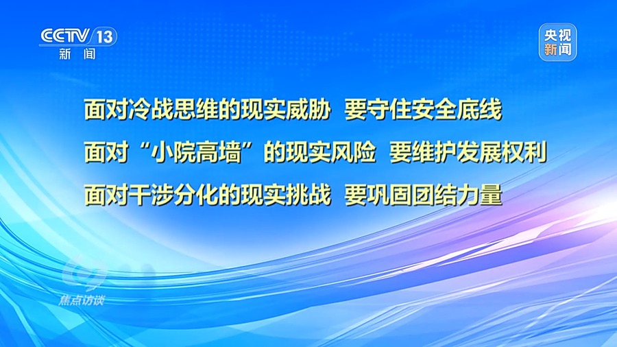 习近平主席强调,面对新形势新挑战,上海合作组织应做到三个“要”:即面对冷战思维的现实威胁,要守住安全底线;面对“小院高墙”的现实风险,要维护发展权利;面对干涉分化的现实挑战,要巩固团结力量。努力建设团结互信的共同家园、和平安宁的共同家园、繁荣发展的共同家园、睦邻友好的共同家园、公平正义的共同家园。