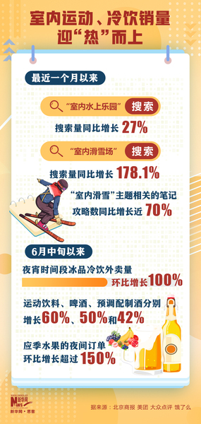 入夏以来,因室外气温较高,人们更多地选择室内运动项目,继续挥洒运动激情。近一个月以来,“室内水上乐园”“室内滑雪场”的关键词搜索量增长迅速。美团、大众点评数据显示,“室内水上乐园”搜索量同比增长27%,“室内滑雪场”搜索量同比增长178.1%,“室内滑雪”主题相关的笔记攻略数同比增长近70%。