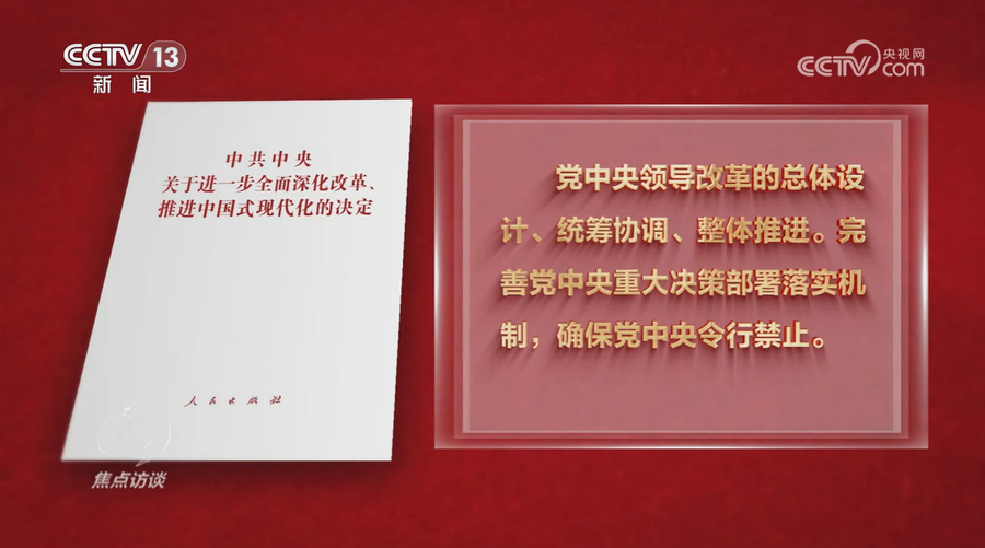 央视网消息(焦点访谈):党的二十届三中全会发出了新时代新征程上进一步全面深化改革的动员令。党的领导是进一步全面深化改革、推进中国式现代化的根本保证。在全面深化改革的新阶段,怎么更好地发挥党的领导作用?全会审议通过的《中共中央关于进一步全面深化改革、推进中国式现代化的决定》,专门就“提高党对进一步全面深化改革、推进中国式现代化的领导水平”作出部署。