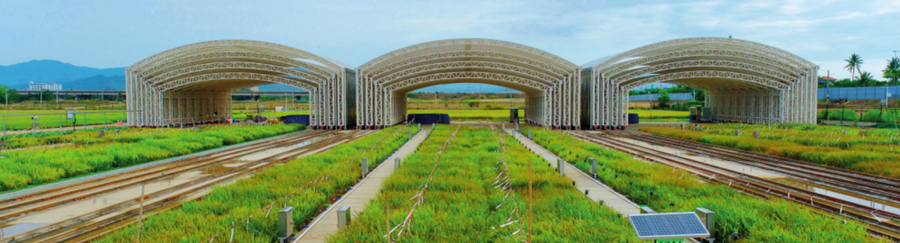 在位于三亚的国家耐盐碱水稻技术创新中心崖州湾总部科研试验基地,建设了高标准试验田、盐(碱)性精准鉴定盐池、自动防雨钢棚、水土盐碱度智能化监测系统等配套设施(2024年5月17日摄)。黎多江摄/本刊