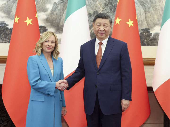 7月29日下午,国家主席习近平在北京钓鱼台国宾馆会见来华进行正式访问的意大利总理梅洛尼。新华社记者 丁海涛 摄