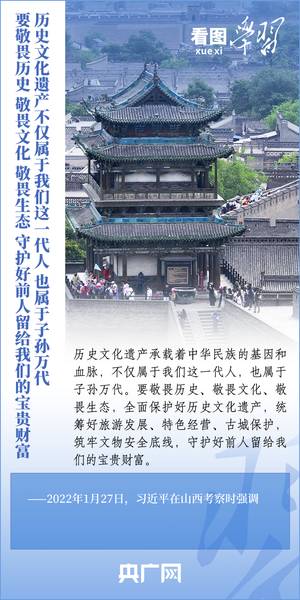 文化遗产是中华优秀传统文化的重要载体,承载着中华民族的基因和血脉。做好历史文化遗产保护传承工作,习近平总书记强调,要统筹好旅游发展、特色经营、古城保护,筑牢文物安全底线,守护好前人留给我们的宝贵财富。