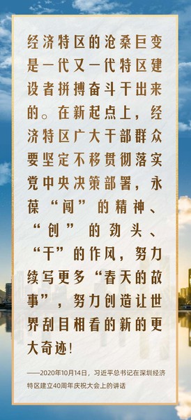 2020年10月,在庆祝深圳经济特区建立40周年之际,习近平总书记又一次来到这里,出席庆祝大会,强调改革不停顿、开放不止步,在更高起点上推进改革开放,推动经济特区工作开创新局面。