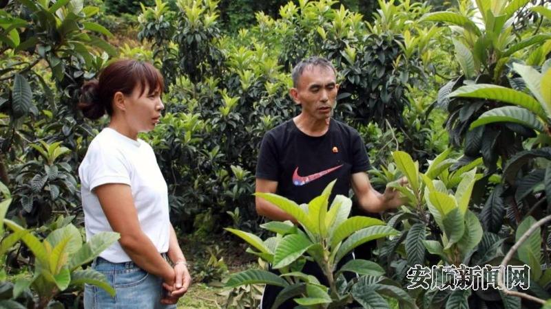 戈尧村党支部支委委员卢发应正在实地指导种植户枇杷管护技术