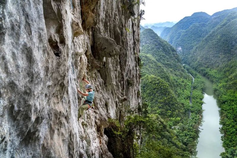 攀岩者在郁郁葱葱的山河美景中攀岩