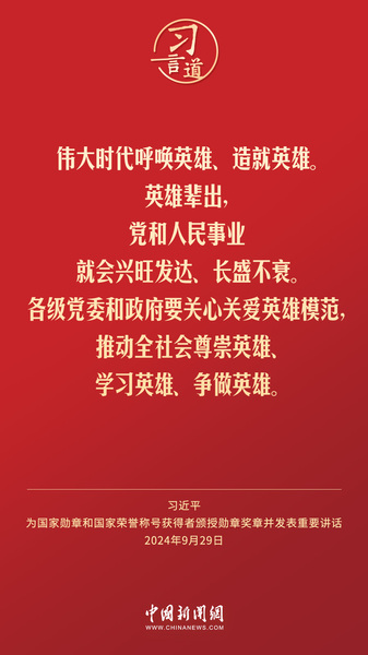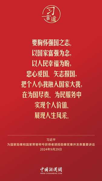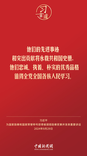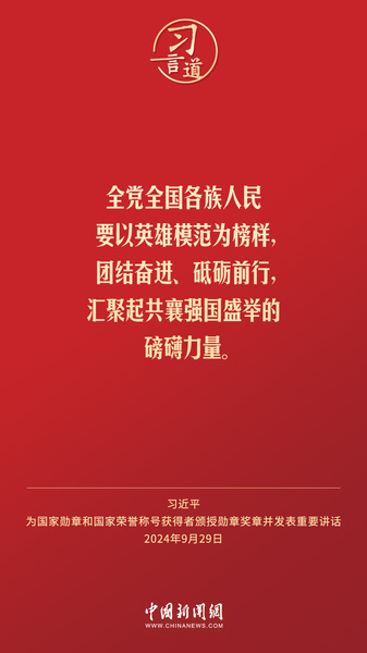 经中共中央批准,中华人民共和国国家勋章和国家荣誉称号颁授仪式于9月29日上午10时在人民大会堂隆重举行。中共中央总书记、国家主席、中央军委主席习近平向国家勋章和国家荣誉称号获得者分别授予“共和国勋章”“友谊勋章”和国家荣誉称号奖章并发表重要讲话。习近平指出——
