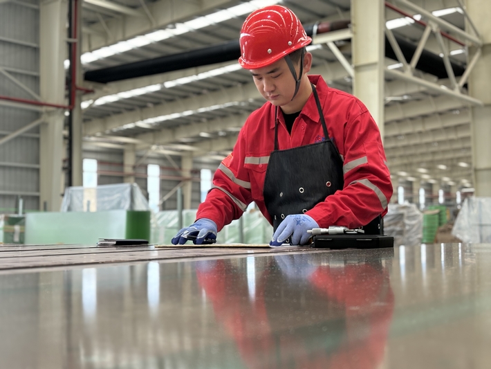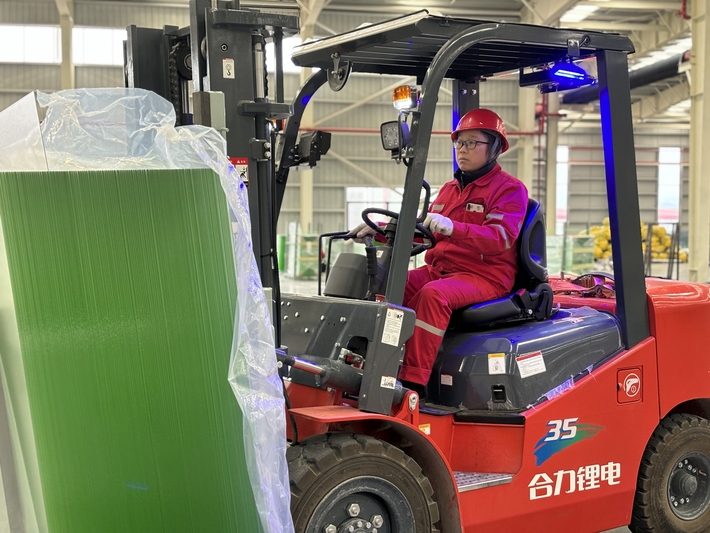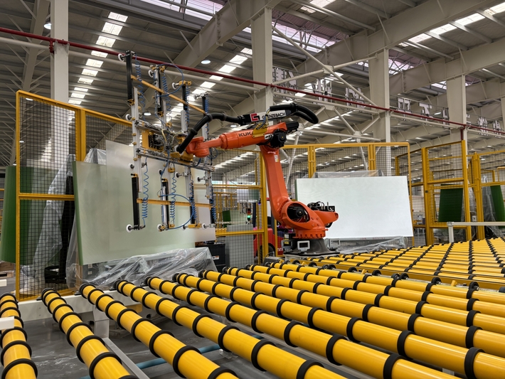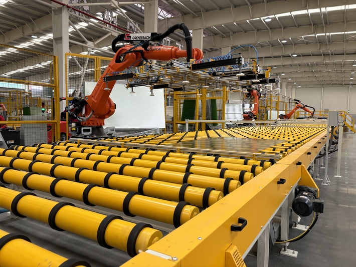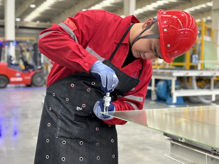 9月下旬,记者走进黔东南州凯里市贵州炉碧经济开发区贵州黔玻永太新材料有限公司的光伏玻璃生产车间,只见光伏玻璃生产线繁忙而有序,自动机械臂上下抓取玻璃,工人们各司其职,叉车来回穿梭。
