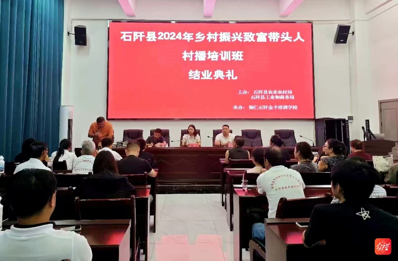 在今年8月为期10天的首次乡村振兴致富带头人“村播”培训班中,来自全县各地40名学员围绕短视频制作和直播团队搭建两大方向,开设创业项目选择、技能实操、现场模拟等主题课程,帮助学员以石阡本土美食、美景、文化为元素,深入挖掘、创意设计短视频和直播创作,推动石阡“村播”出圈出彩,助力“村播经济”快速发展。
