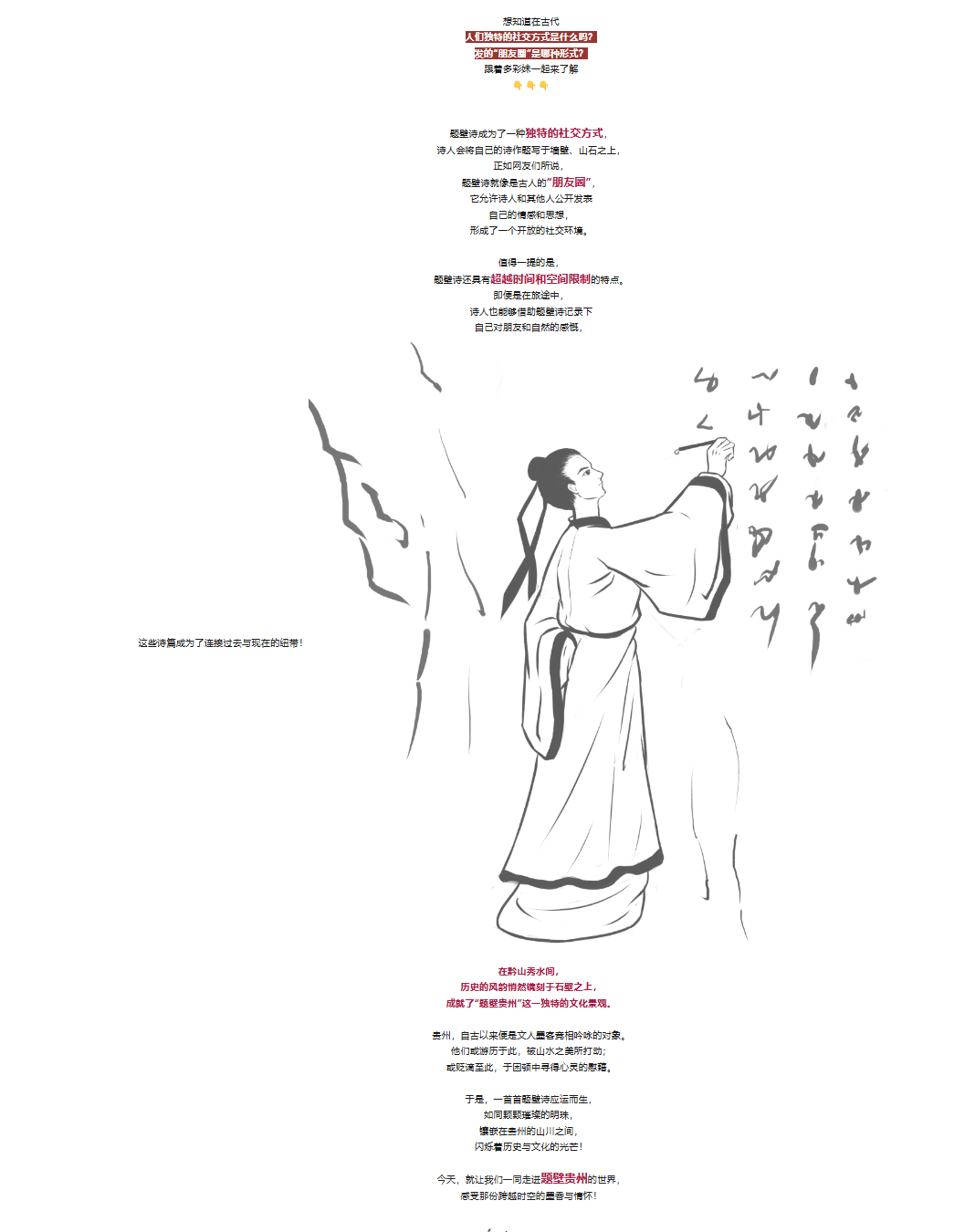 《忆秦娥·娄山关》 毛泽东 西风烈,长空雁叫霜晨月。 毛泽东词碑建于1973年。该词碑宽25米,高13.55米,用396块云南大理石嵌成碑面,镌刻了毛泽东《忆秦娥·娄山关》手迹。 《忆秦娥·娄山关》这首词最早发表在《诗刊》一九五七年一月号,此词慷慨悲烈,写景状物。忆秦娥是词牌名,源于李白的词句“秦娥梦断秦楼月”。娄山关是本词题目,也是本词的写作地点。 娄山关,在贵州省遵义城北娄山的最高峰上,建立在险峻的山峰之间,是贵州北部进入四川的重要隘口,是防守贵州北部重镇遵义的要冲。 中央红军长征时,于1935年1月占领遵义,召开了中国革命历史上具有伟大意义的遵义会议。会后,红军经娄山关北上,原准备在泸州和宜宾之间渡过长江。没有成功,就折回再向遵义进军,在途中经半天激战打败了扼守娄山关的贵州军阀王家烈部一个师,乘胜重占遵义。这首词写的就是这次攻克娄山关的战斗。 《兴隆卫书壁》 明·王守仁 山城高下见楼台,野戍参差暮角催。 贵竹路从峰顶入,夜郎人自日边来。 莺花夹道惊春老,雉堞连云向晚开。 尺素屡题还屡掷,衡阳那有雁飞回。 王守仁,本名王云,浙江余姚人,是明朝杰出的思想家、文学家、军事家、教育家。相较于王守仁,他的另一个名字更为世人所熟知——王阳明。而与王阳明这个名字相伴相生的除了“心学”还有一个地名——贵州。 贵州,这个在五百年前的大明王朝,在王阳明的笔下展现出“此境奇绝”的绝妙风采。也正是在这块“福地”,本以为是“渡劫”之旅的王阳明却在此悟道成圣,从此走上“开挂”之路,贵州也因此成为公认的“王学圣地”。 王阳明在贵州题诗的碑位于兴隆卫的飞云崖上(今贵州省黔东南州黄平县城东北12公里处)。1508年初春,王阳明遭辱被贬,到达兴隆卫时,站在飞云崖上俯瞰山城美景时写下《兴隆卫书壁》。诗中“贵竹路从峰顶入,夜郎人自日边来”一句,生动传神的描写了“黔路”的艰险和少数民族的生活情景,一幅攀登崎岖山路的暮归人图景跃然纸上。 飞云崖,亦称飞云洞,留存数十处摩崖摩崖,历代到此的文人墨客都不惜立下自己的笔墨,因此这里变成为了一个“书法博览馆”。根据统计,飞云崖保留的的诗文、联语、摩崖、碑碣总量位居贵州第一。除了王阳明之外,还有宋湘、鄂尔泰、傅恒、福康安、林则徐等著名的人物到此留下墨迹。 《咏文峰塔诗》 清·陶廷杰 水抱全城万象涵,到头关键岂空谈。 据《明清贵州700进士》(厐思纯著)《都匀市志》等史料记载:陶廷杰,字涵三、子俊,号莲生,清乾隆五十年(1785年)。他先后担任湖广道和山东道监察御史、吏部给事中(谏官),兼稽察富新仓、广东学政、刑部给事中、江苏苏松太道、甘肃按察使、陕西布政使、陕西巡抚。 ▲1969年的都匀文峰塔 陶廷杰为官数十年,清正廉洁,克己奉公,力除积弊,平反冤案数十起。他乐善好施、热心公益,重视教育文化;他学识渊博,尤以诗歌造诣很深。时任甘肃按察使的陶廷杰,得知家乡都匀文峰塔年久失修而损毁,很快捐银1000两并致书家乡重建文峰塔,都匀太守陈西桥、知县钟海民也捐银2000两,次年建成七节新塔。 此诗歌寄托了他对家乡“拾青紫科第者蒸蒸日上”的期望。如今,文峰塔成为昌盛都匀乃至黔南文化的象征,是都匀城市文化地标之一,是贵州唯一载入《中国古塔》图册的石塔,被列为贵州省文物保护单位。 《贵州飞云洞题壁》 清·宋湘 我与青山是旧游,青山能识旧人不。 宋湘,字焕襄,号芷湾,清代中叶著名的诗人、书法家、教育家,政声廉明的清官。被称为“岭南第一才子”。嘉庆四年(1799年),进士及第,授翰林院编修,出任惠州丰湖书院和广州粤秀书院主讲,历任文渊阁校理、国史馆总纂、四川及贵州乡试主考官、曲靖广南永昌三地知府,累迁湖北粮道。 宋湘以翰林身份主持贵州乡试时曾游此地,现在旧地重游,心中自然别有一番感触,这首题壁诗抒发了宋湘重游飞云洞时的物是人非、年岁不与的感慨。他认为人生短暂而变幻无常,而自然则是永恒不变的。 《黔灵山题壁二首》 清·赤松 青山隐隐白云横, 一片闲花野色晴。 溪上数椽茅屋稳, 绿阴清昼有书声。 翠嶂清溪跨白牛, 乐眠水草已忘忧。 横吹铁笛无腔调, 水月松风一韵收。 这首题壁诗是为弘福寺开山僧人赤松所作,描写黔灵山清幽静谧的自然景色以及作者恬淡闲适的情趣。清康熙十一年(1672)僧人赤松斩草开石,辟为佛地,创建弘福寺于山上,称黔南第一丛林。 诗中的黔灵山那时候还不是公园,清康熙十一年 (1672年),赤松和尚云游至此,见大罗岭南众山之间有片窝地很平,于是向罗氏化缘求捐,赤松结茅庵于山中,初期取名"黔灵山寺",意为"贵州之灵山",后来改名弘福寺。 黔灵山,位于贵州省贵阳市云岩区,是贵阳市民休闲和外地游客的打卡点,始建于1957年,公园依托黔灵山而建。是集自然风光、文物古迹、民俗风情和娱乐休闲为一体的综合性公园。为国家AAAA级旅游景区,被称为“黔南第一山”。 这些题壁诗, 如同贵州大地上的文化密码, 等待着我们去解读、去传承。 它们不仅记录了古人的足迹与情感, 更蕴含了贵州深厚的文化底蕴和独特的地域风情。 如今,当我们再次踏上这片神奇的土地, 不妨放慢脚步, 用心去聆听那些题壁诗中的低吟浅唱。 或许,在某个不经意的瞬间, 你会与一首诗、一段历史不期而遇, 从而更加深刻地理解贵