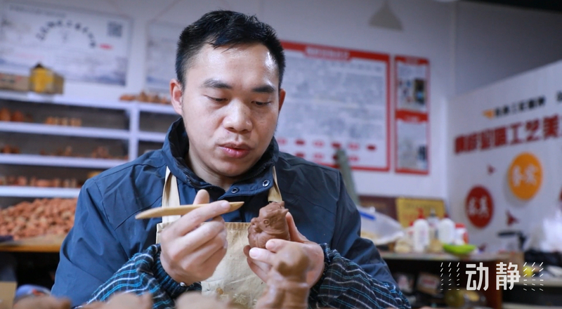 捏制、开哨、修整……不到10分钟,一个栩栩如生的龙形泥哨半成品便展现在人们眼前。桐梓县桐梓记忆商业街的一间工坊里摆满了形态各异的十二生肖系列泥哨,桐梓县非物质文化遗产桐梓泥哨制作技艺传承人姚德波正在其间精心制作着他的宝贝“泥疙瘩”。“制作泥哨的过程中要注意捏制的造型,比如我现在手上这个龙,要注意(它的)眼睛,还有鼻孔、开孔、纹路,一定要注意,不然就缺乏了一些美感。”