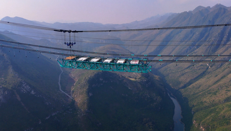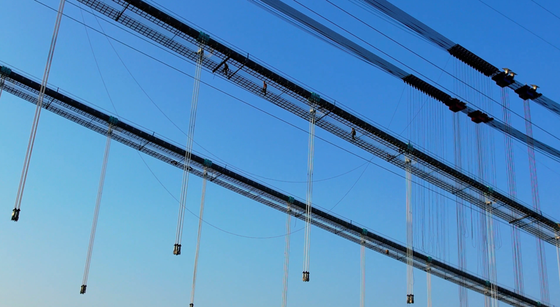 对于悬索桥而言,几乎所有承重都依靠两根主缆,它从主跨中部向两岸伸展,像臂膀一样将桥梁的荷载重量传递到峡谷两岸的主塔和锚碇上。花江峡谷大桥的两根主缆均由217根索股组成,一根索股43.4吨重,2378米长。在600多米高空逐一精准架设,难度可想而知。