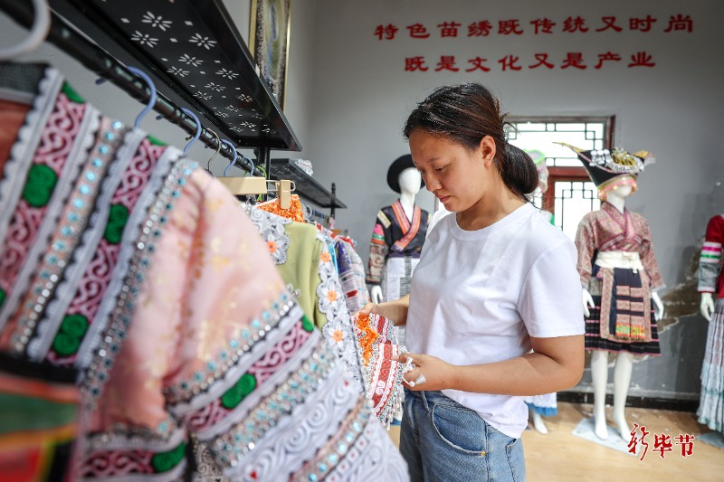 在村里的帮助和支持下,这几年,杨文丽负责的工坊带动了20多位绣娘实现稳定就业。今年以来,苗绣工坊销售额已超过230万元,姑娘们在用自己的方式传承并创新着民族传统的技艺和文化,化屋村蝶变也有她们的一份力量。