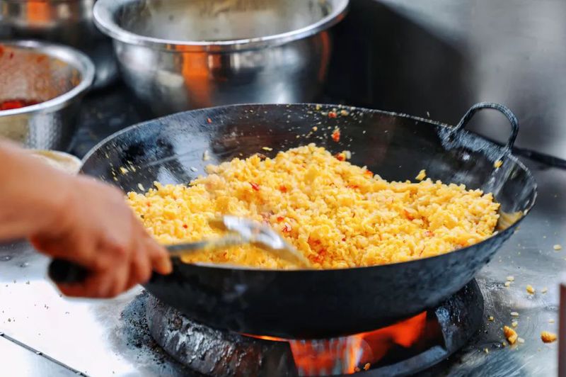 打蛋、放饭、颠勺……步骤看似简单,将米粒炒得颗颗分明,金黄的蛋黄裹着米饭,搭配酸爽小菜,细细咀嚼,一口碳水下肚,让人直呼美味!