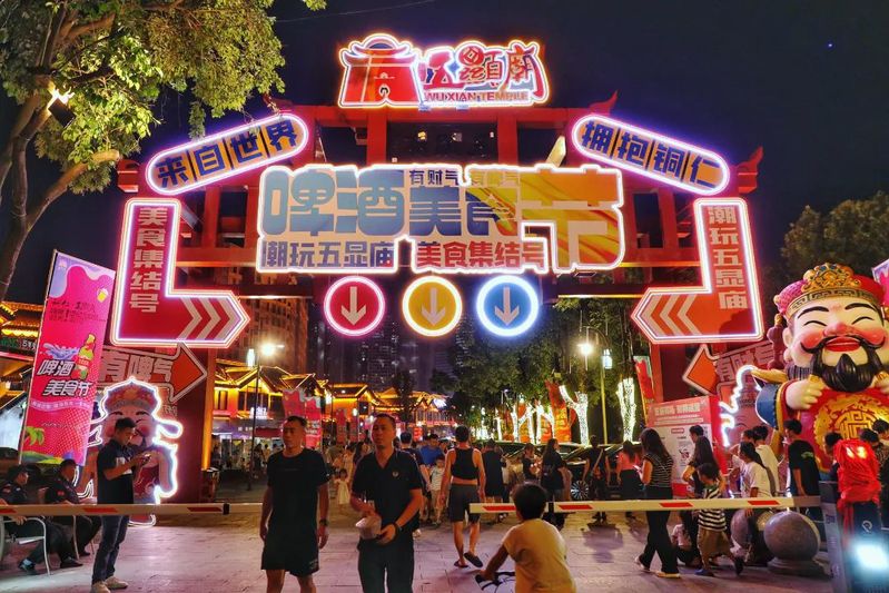 铜仁五显庙,是个热门景点。作为传统文化与现代时尚结合的潮流街区,今年五显庙以全新面貌呈现,成为集休闲与潮流、美食与购物于一体的文旅街区。贵州丝娃娃、万峰林蛋炒饭、酸汤牛肉火锅等极具特色的贵州各地小吃汇集于此,让来黔游客仅此一站便能吃遍贵州。