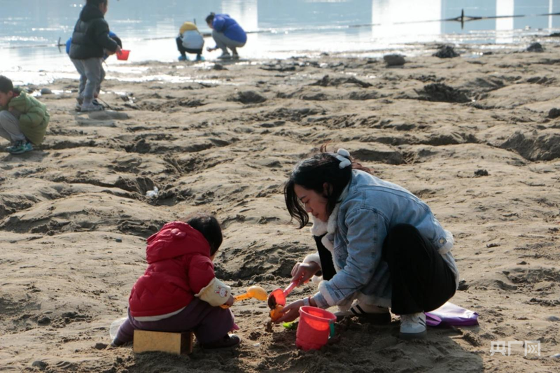 家长带孩子在兴隆湖沙滩上玩耍(央广网发 天府新区融媒中心供图)
