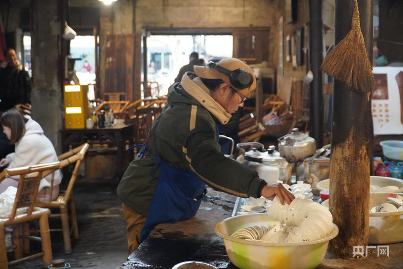 李强正戴着蓝布围裙,在茶馆里忙碌(央广网记者 昌思荣 摄)