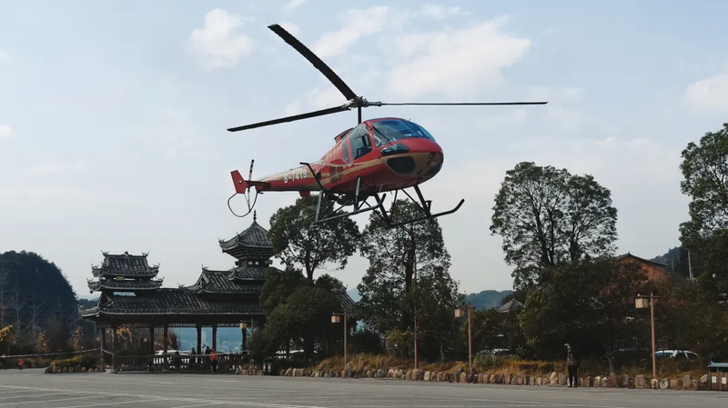 “景景串飞”低空旅游项目作为贵州省首条低空旅游景区串飞航线,目前已开通黄平-凯里-雷山-西江线,并在凯里市、黎平县、镇远古城等地建设多个直升机停机坪,满足A3级通用航空的运输需求。“景景串飞”在为游客提供全新游览体验的同时,进一步丰富黔东南州的旅游产品体系。