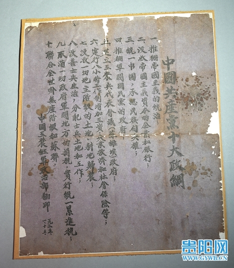 现收藏在贵州省博物馆的这张《中国共产党十大政纲》为长方形蓝色书面纸,直行石印。全文为: