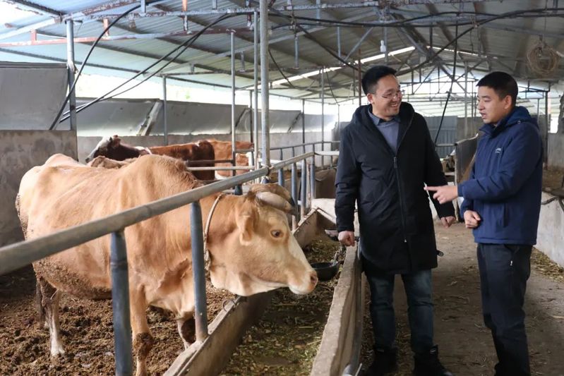 饶茂富(左)到辖区养殖大户家中了解肉牛的养殖、防疫等情况。