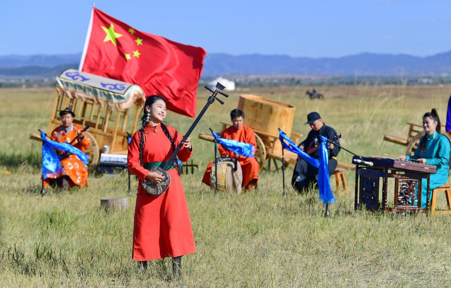 2023年9月30日,呼和浩特,乌兰牧骑的队员在敕勒川草原表演。