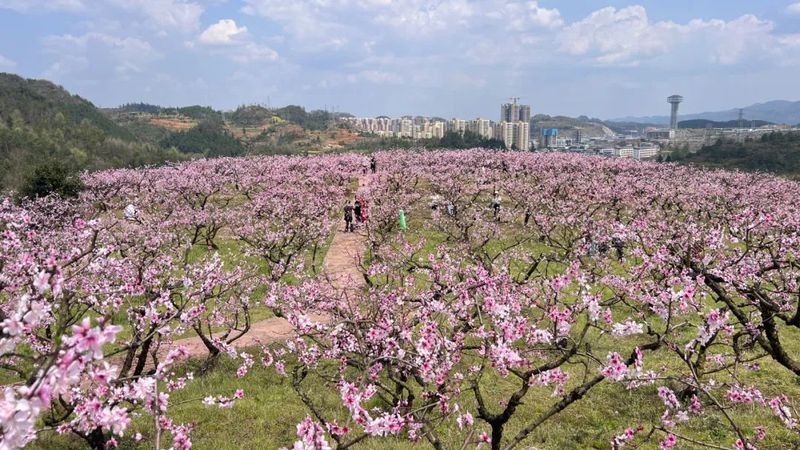 离城区仅有5公里路程的灯塔街道白岩溪社区的黔东观光果园,300多亩桃花盛开迎客。满山的桃花竞相绽放,粉色的桃花层层叠叠缀满枝头,游客们三五成群穿梭于花间拍照留念。