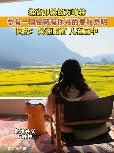 春日万峰林 邢贵龙 摄 近日,黔西南的群山之间,一场金色的盛宴正悄然铺展。在被誉为“中国锥状喀斯特博物馆”的万峰林景区,油菜花迎风怒放,层叠的金色花海与连绵的喀斯特峰丛相映成辉,构成一幅壮丽的生态画卷。 清晨,薄雾尚未散尽,万峰林脚下的纳灰村已热闹起来。来自广东的摄影爱好者王海生早早架起三脚架,镜头对准远处错落有致的峰林与近处翻涌的花浪。“这里的油菜花不是平面的,而是立体的——峰林是背景,田埂是线条,花海是色彩,层次感独一无二。”他兴奋地说道。 万峰林的油菜花种植始于农耕传统,却因自然与人文的巧妙结合而闻名遐迩。峰林间金黄花海随山形起伏,宛如大地的调色盘。 万峰林景区里一场金色的盛宴正悄然铺展 目前,6000亩油菜花也逐渐进入盛花期。油菜花像一张巨大的金色地毯铺展在田野上,空气中弥漫着淡淡花香。景区相关负责人介绍,依托气候优势与精细化田间管理,今年花海景观“成色更足”,春节期间万峰林景区单日接待游客量也突破了8万人次。 乘坐观光车一路俯瞰最美油菜花田 在这里,赏花的方式多种多样,或乘坐观光车一路俯瞰最美花田;或乘着小火车穿梭花海奔赴春天;或骑行、漫步在步道与春天近距离接触;或是选一家花田小店坐下,喝着咖啡,感受双重香味的加持。峰林如千军列阵,花田若金毯铺陈,蜿蜒的纳灰河如银链穿行其间。来自成都的游客陈女士感叹:“没想到西南喀斯特地貌与花海的组合这么震撼!”