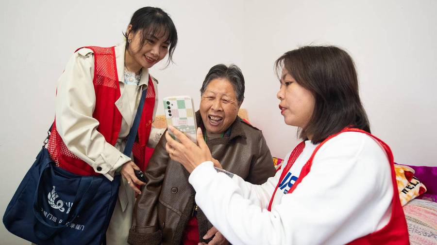 在武汉市青和居社区,“天天敲门组”志愿者上门为困难老人排忧解难。(湖北日报全媒记者 何宇欣 摄)