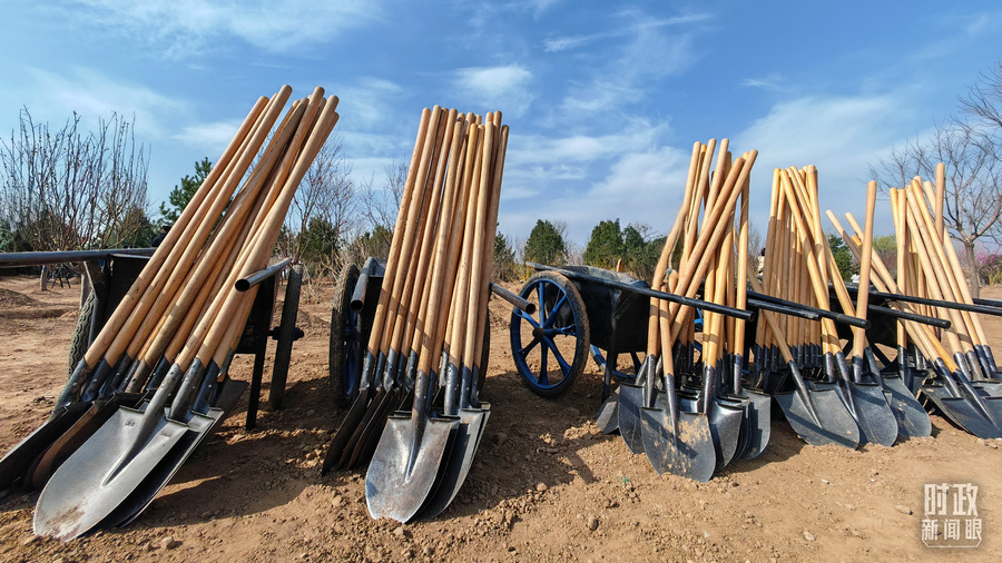 △植树现场整齐摆放的工具。(总台央视记者王策拍摄)