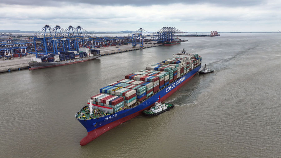 2024年12月18日拍摄的上海港洋山港区(无人机全景照片)。2024年,上海港集装箱年吞吐量突破5000万标箱,成为全球首个突破这一数字的集装箱码头;近350条国际航线连接起中国和全球200多个国家和地区的700多个港口。
