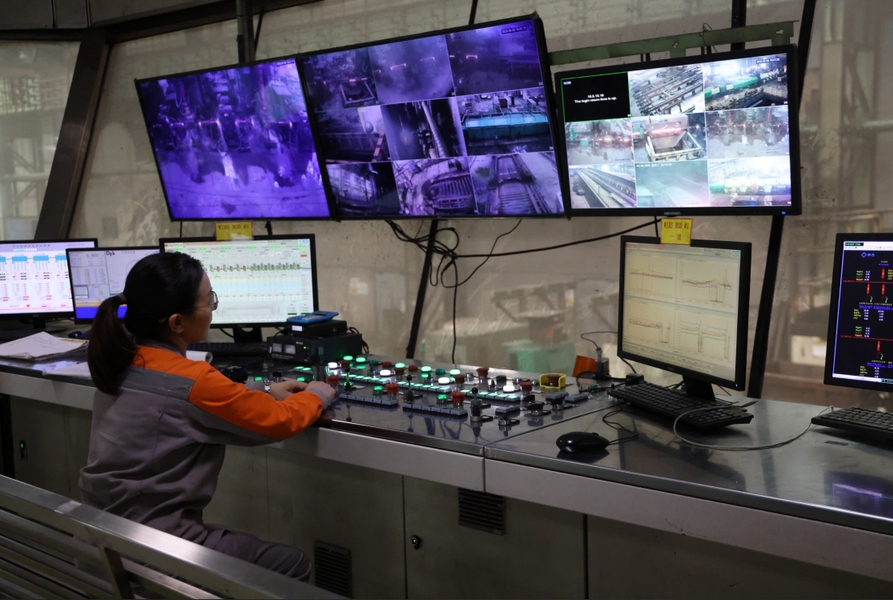 工作人员在马中关丹产业园内的联合钢铁生产车间内工作。(人民日报记者杨一摄)