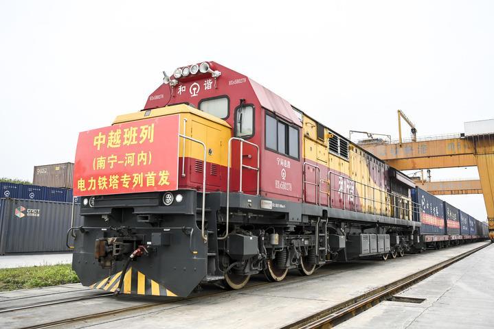 2024年3月8日,在广西南宁国际铁路港,电力铁塔专列准备发车。当日,一列满载340吨电力铁塔的中越班列从南宁国际铁路港开出,发往越南河内。新华社记者曹祎铭摄