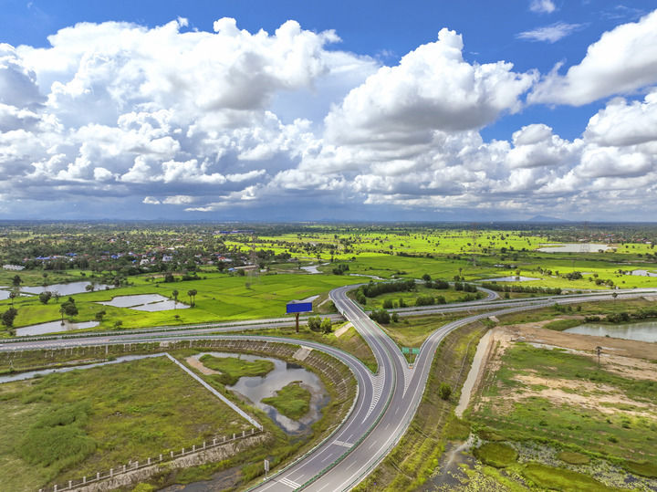 这是2024年9月25日在柬埔寨磅士卑省拍摄的金港高速公路(无人机照片)。金港高速公路是中国路桥工程有限责任公司(中国路桥)按“建造-运营-移交”模式投资的项目。新华社发(柬埔寨金港高速公路有限公司供图)